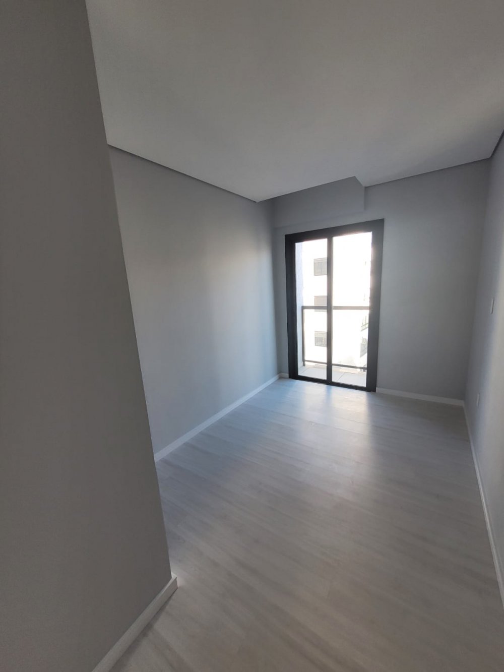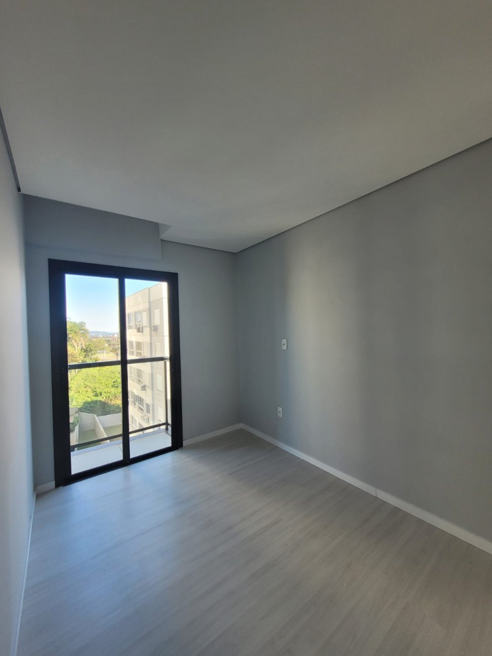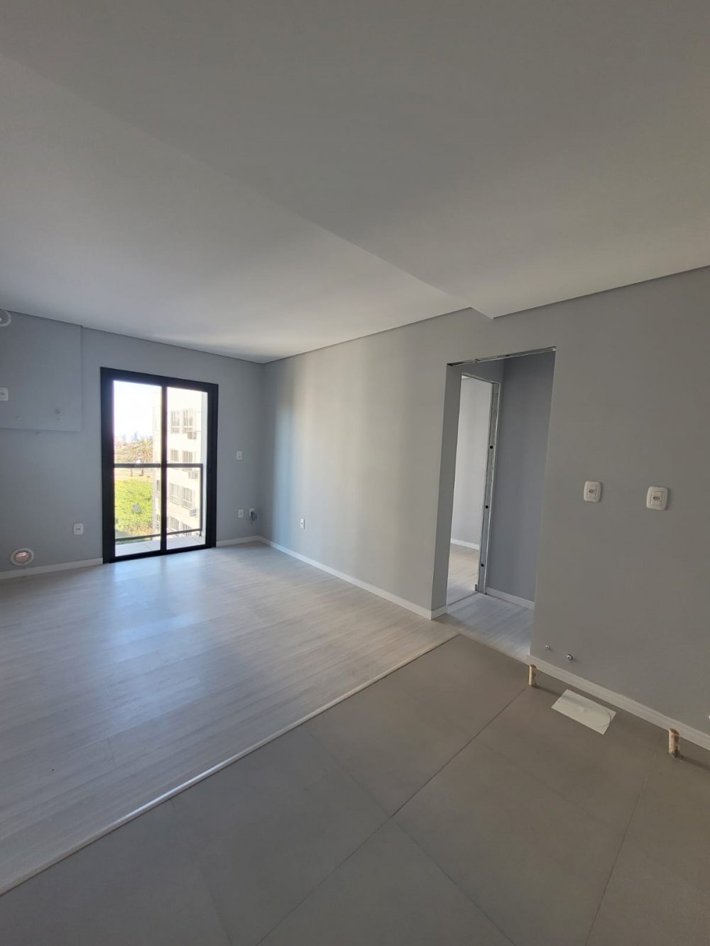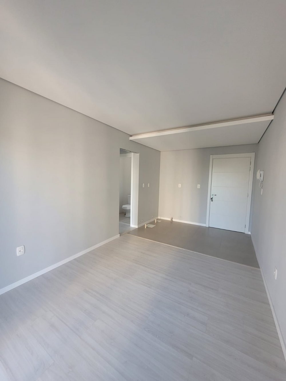 Piso porcelanato nas áreas sociais e laminado nos quartos, garantindo um acabamento moderno.